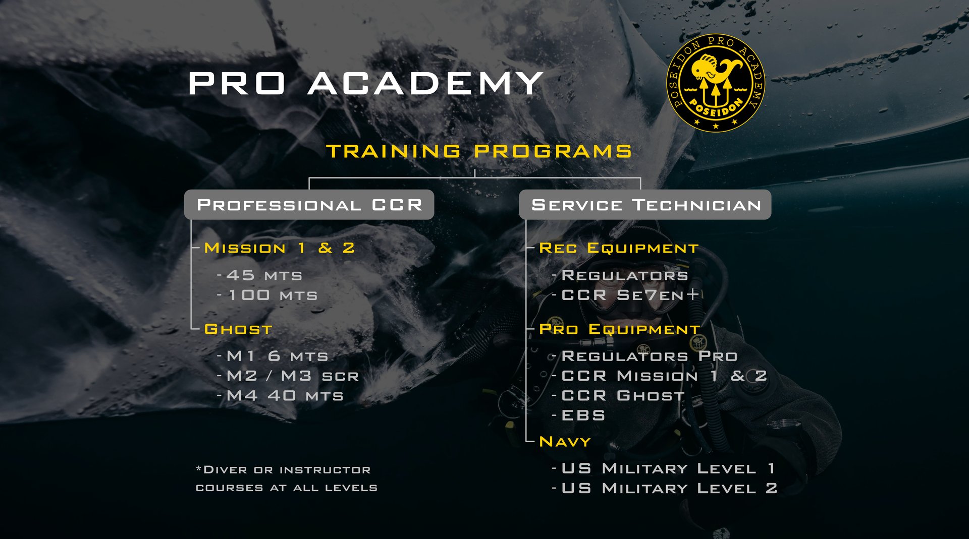 También preparamos a tus buzos para el programa de Técnico CCR, que incluye los rebreathers Ghost, Se7en, Se7en+, Mission y Mission 2.